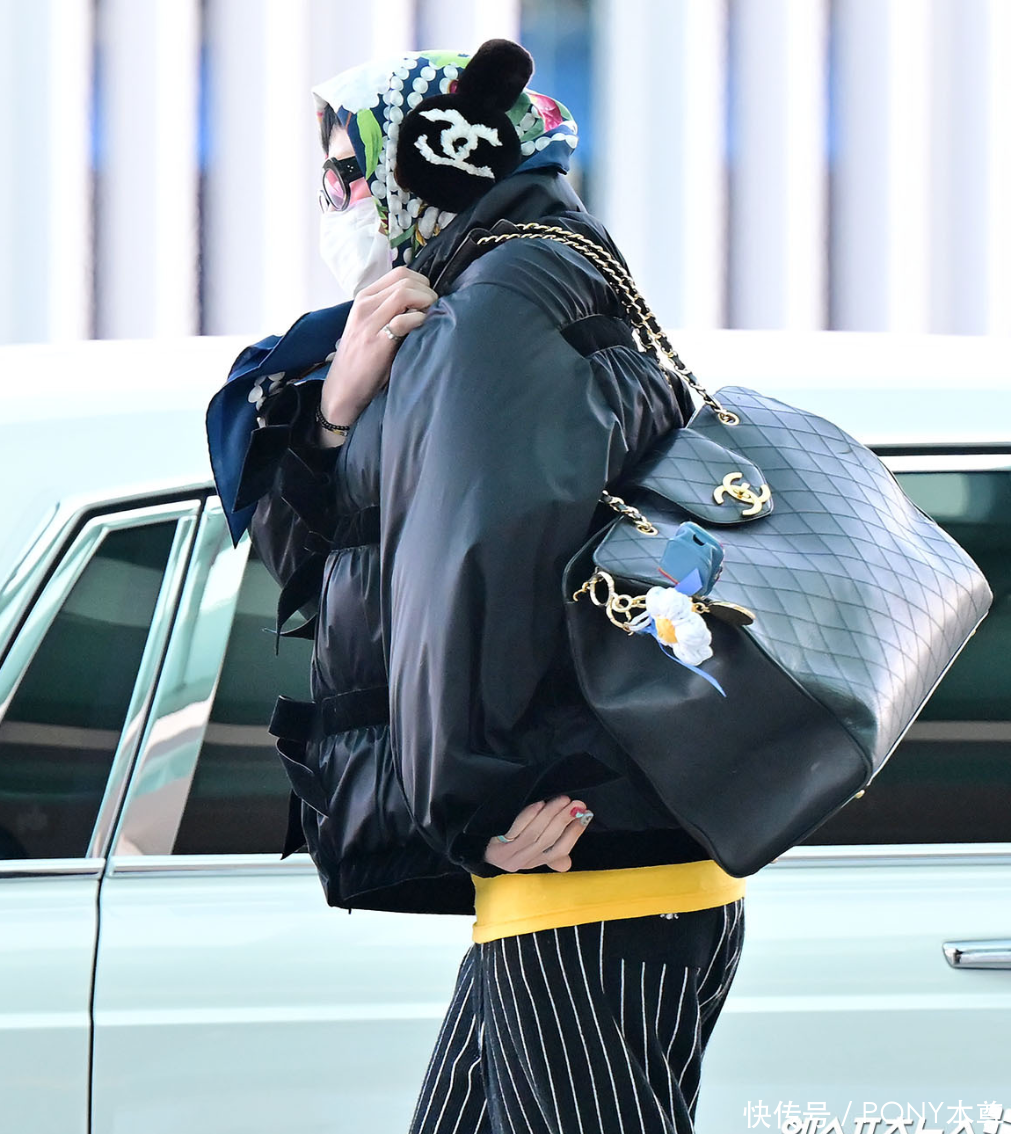 裤子选择了黑白竖条纹款式,斜跨黑色香奈儿包包,整个人看起来就像是行走“货架”