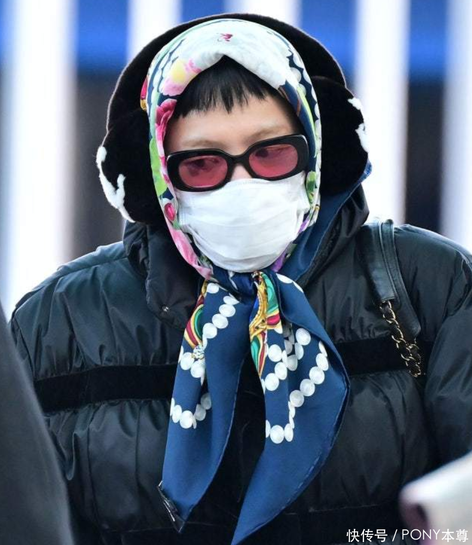 这次,他头戴蓝绿撞色三角围巾,佩戴了黑色边框玫红色墨镜,耳朵上搭配了黑色耳罩,包裹的严严实实!