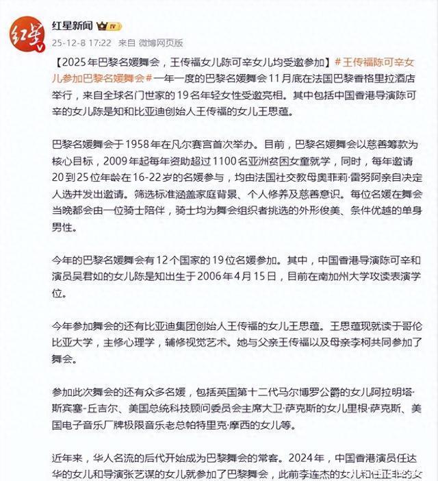另一边,陈可辛与吴君如的爱女陈是知(JillianChan),则走上了艺术之路。19岁的她正在南加州大学攻读表演学位,不仅客串过父亲的作品,也活跃于舞台剧。她选择的是一件黎巴嫩高定品牌GeorgesHobeika的宝蓝色水晶镶钻拖尾礼服,舞伴是希腊籍的NikolasManos,星光熠熠,颇有继承父母衣钵的风范。 她们的亮相,让华人名流后代参与巴黎名媛舞会的名单又添上了新的一笔。回顾近年,这几乎成了一种“新传统”:2024年,导演张艺谋的女儿张壹娇、演员任达华的女儿任晴佳曾受邀出席;更早之前,李连杰的女儿和华为创始人任正非的女儿姚安娜也都曾是舞会上的东方明珠。这似乎印证了舞会筛选标准中,对“个人成就与教育”的看重,而不仅仅是家族财富的简单叠加。 当然,舞会的宾客名单本身就是一部“全球世家谱”。与王思蕴、陈是知同场的,还有英国第十二代马尔博罗公爵的女儿、美国总统科技顾问委员会主席的女儿、美国音乐厂牌巨头的千金等。这更像是一个微缩的顶级社交与慈善舞台。 从李连杰、任正非,到张艺谋、王传福、陈可辛,华人面孔在巴黎名媛舞会上从罕见变为常客,背后折射的或许不仅是财富的积累,更是华人家庭对下一代国际化教育、综合素质培养的重视与成果。当“豪门千金”的剧本不再局限于炫富与绯闻,而是与常春藤名校、艺术追求、慈善之心绑定在一起时,公众的讨论也从单纯的“羡慕”转向了更具深度的审视。下一次,又会是哪位中国面孔,在这个融合了古典礼仪与现代慈善的舞台上,写下新的注脚呢?