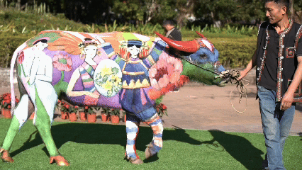 江城牛体彩绘源自防止猛兽侵害耕牛的民间传统,历经演变,如今已成为一门承载故事与祝福的流动艺术。艺术家以五彩画笔,在牛身上描绘美丽传说与美好愿景,延续着古老习俗与当代创意的交融。