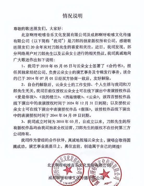 为了避嫌,也为了各自的发展,他们慢慢减少了同台。 直到2023年刀郎复出开演唱会,云朵的缺席让“背叛师门”的质疑铺天盖地。 直到刀郎工作室发声明,大家才知道真相:两人早在2014年就友好解约,2024年歌曲版权也已回收。